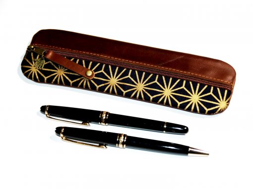 Federmäppchen Leder & Stoff „Asanoha Gold auf Nachtblau”