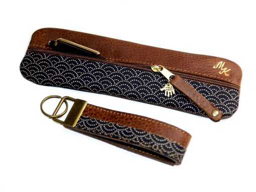 Handgefertigt aus braunem gewachstem Leder kombiniert mit traditionellem japanischen Stoff „Wellen- Seigaiha” in einem tiefen Dunkelblau.